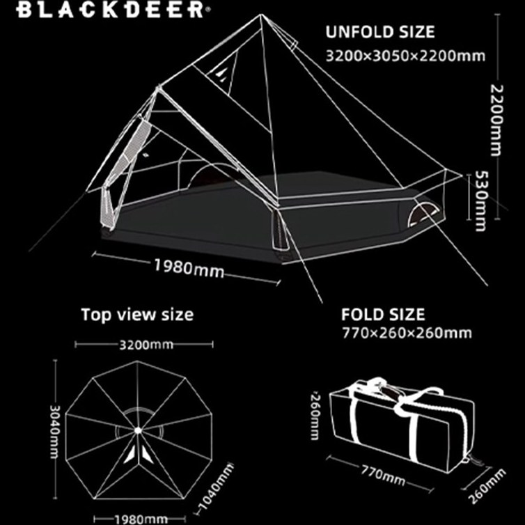 - تهویه: چادر های بلک دیر معمولا دارای پنجره های تهویه با توری برای جلوگیری از ورود حشرات و بهبود جریان هوا هستند. همچنین دارای درب های دو لایه با پارچه و طوری هستند.